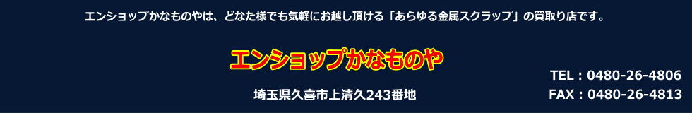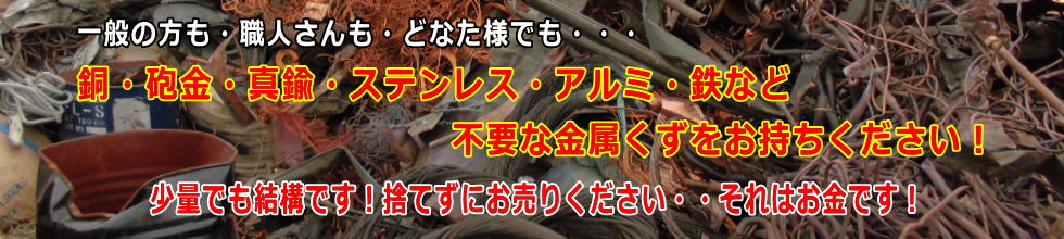 10| お知らせ ▶2025/2/17 乾電池以外のあらゆる「バッテリー」を買取り(もしくは引取り)出来るようになりました! ▶2024/9/24「mRNAワクチン(レプリコン)」を接種された方の対応は出来ません! ▶2024/1/20「不要家電品の無料引取り始めました」 これまで引取を拒否していました「家電品」俗に言う(白物家電)ですが、冷蔵庫・ブラウン管テレビ、 ブラウン管PCモニター以外でしたら、お持ち込みに限りどんな家電品も無料にて引取処分が出来る様になりました。 詳しくはお電話等にてお問い合わせください。 ▶2023/5/1「営業時間変更のお知らせ」 日頃より皆様には大変お世話になっております。 この度、営業時間の変更を致しました。 営業日:月曜日~土曜日(日曜・祝・祭日除く) 営業時間:AM9:00~PM6:30 定休日:日曜日/祝祭日/他:臨時休業日となります。 お客様には、仕事帰りに立ち寄れる、 「便利なスクラップ屋」を目指して行きますので、これまで以上のご哀願のもと宜しくお願い致します。 ▶2023/1/20 不要な古い「ブラザーミシン/ジャノメミシン」の買取を始めました! ▶2017/10/1「近隣の電気工事屋さんへのご提案」 工事現場への電線屑引取りサービスを行っております。 2tトラック一杯以上の廃電線屑がございましたら、関東圏内どこへでも無料にて引取りに伺わせて頂きます。 ご指定の場所までトラックにて出向きますので、電線屑を積込み後にお客様とご同行のもと、 弊社にて「荷卸し➡重量計測➡お支払い」と迅速な対応をさせて頂きます。 詳しくは、お気軽にお問い合わせください。 ▶2017/8/22「一般のお客様へのご提案」 ご家庭から出る、不要になったフライパンやナベ類、 ノートPC、デスクトップ本体プリンターなども引取りしております。 (※フライパン・なべ類などは軽量の為、2個以上お持ち頂けないと重量が計れませんのでご留意ください) たとえ少量でも、町の危険物としてゴミに出さずにお気軽にお持ちください。それはお金です。 |
