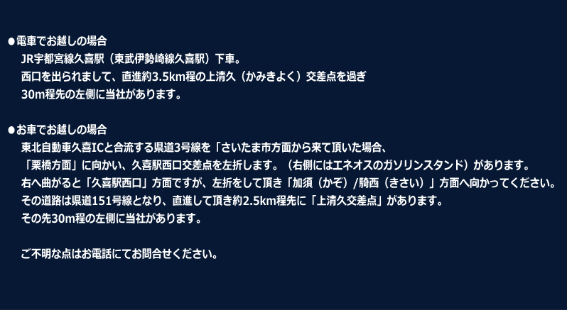 | 営業日:月曜日~土曜日 営業時間:AM 9:00~PM 6:00(6:30)定休日:日曜日/祝日 |
